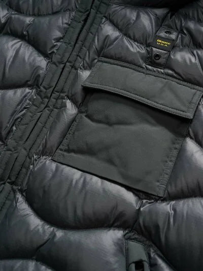 Inserti in taslan in tono sul profilo del cappuccio e delle zip e nel taschino applicato sul petto.